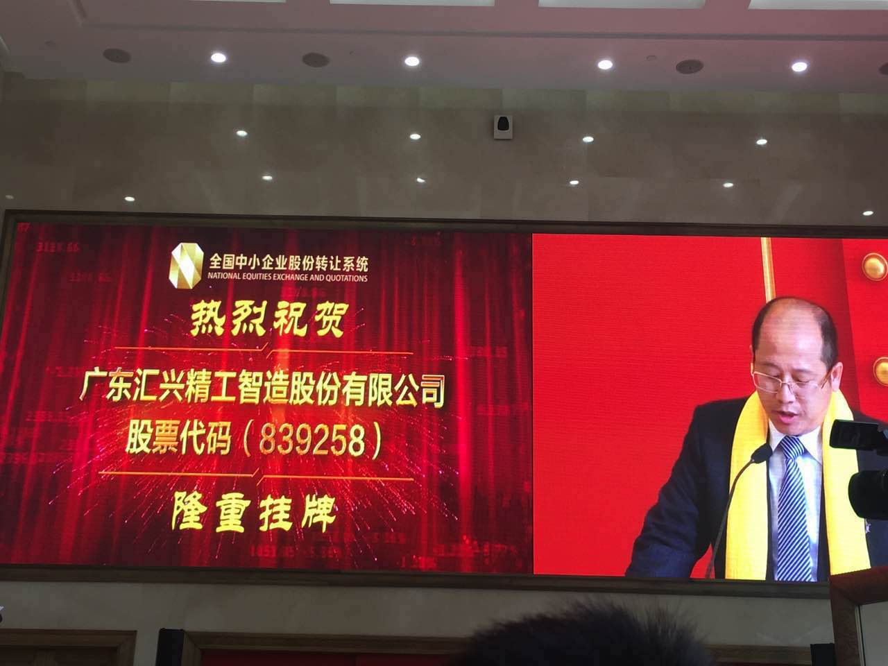 2016年11月1日上午10點(diǎn),廣東匯興精工智造股份有限公司(股票代碼:839258)以下簡(jiǎn)稱匯興智造,在全國(guó)中小企業(yè)股份轉(zhuǎn)讓系統(tǒng)儀式大廳隆重舉行掛牌上市儀式。參加此次掛牌事宜內(nèi)部嘉賓主要代表有鐘輝董事長(zhǎng)、昆山公司鐘世鑫總經(jīng)理、重慶公司胡偉路總經(jīng)理、李福生總經(jīng)理、呂常垣總經(jīng)理、鄧高全總監(jiān)等董監(jiān)高10余人。由鐘輝董事長(zhǎng)代表發(fā)言及敲鐘儀式。成為了中國(guó)資本市場(chǎng)上首家以“精工智造股份有限公司”名稱掛牌上市的企業(yè)。