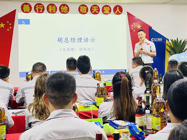 會議第五項,胡偉路總經(jīng)理講話。首先胡總經(jīng)理感嘆時光飛逝,歲月如梭,驀然回首,已到初秋之際,2021年僅剩下僅有的100多天,在這攻堅的三月里,全體員工仍需拿出“紅軍不怕遠征難 萬水千山只等閑”的民族氣概,朝著我們的目標(biāo)拿出我們的士氣卯足勁兒的向前沖;其二、胡總經(jīng)理向全體員工展示公司中秋禮品并解析禮品寓意(柴、米、油、鹽、醬、醋、茶),以生活中不可缺之的物品讓全體員工深刻感受到公司的關(guān)懷和關(guān)愛,并從側(cè)面宣導(dǎo)全體員工在工作崗位中,對待同事要有溫度,對待工作要有態(tài)度;花若盛開,蝴蝶自來,你若精彩,上天自會安排;其三、通過一則短視頻向全體員工宣導(dǎo)反哺之恩 、舐犢之情,進一步勉勵全體員工要有一顆感恩的心,感恩身邊的人;其四、創(chuàng)立夢想基金,鼓勵員工加大產(chǎn)值賦能,為公司為個人謀福利;同時也進一步勉勵全體員工,“寶劍鋒從磨礪出,梅花香自苦寒來”,只要我們一起努力,相信我們一定會實現(xiàn)我們的目標(biāo),讓我們一起擼起袖子加油干!