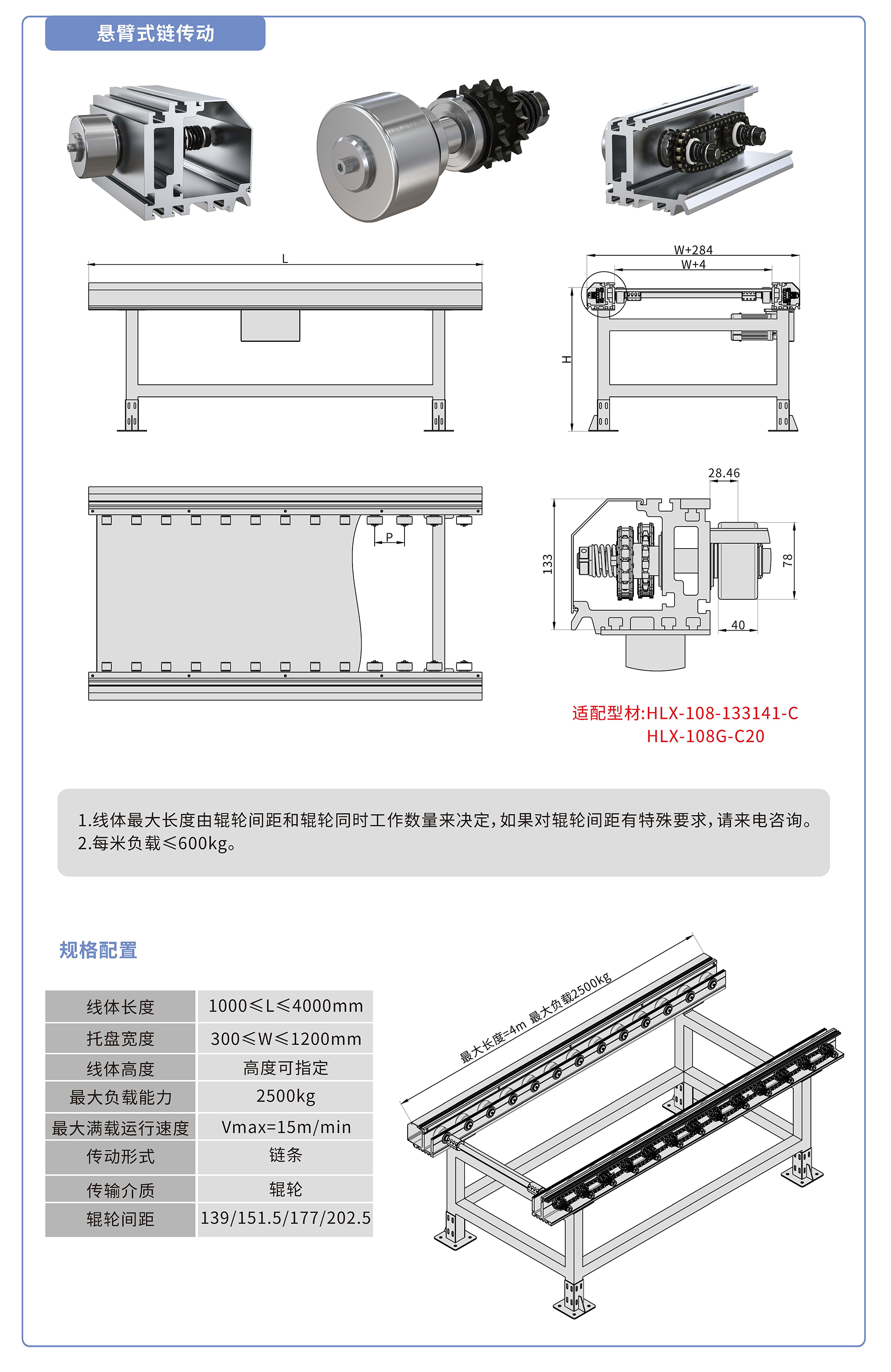 采用133141鋁型材,鏈輪傳動,鍍鉻滾輪鑲嵌銅套實現(xiàn)積放功能,負載2500kg/米,最大負載速度15M/min, 輪距139、151.5、177、202.5可選,適用托盤寬度300-1200mm,線體長度范圍1000-4000mm, 高度根據(jù)需求定制.